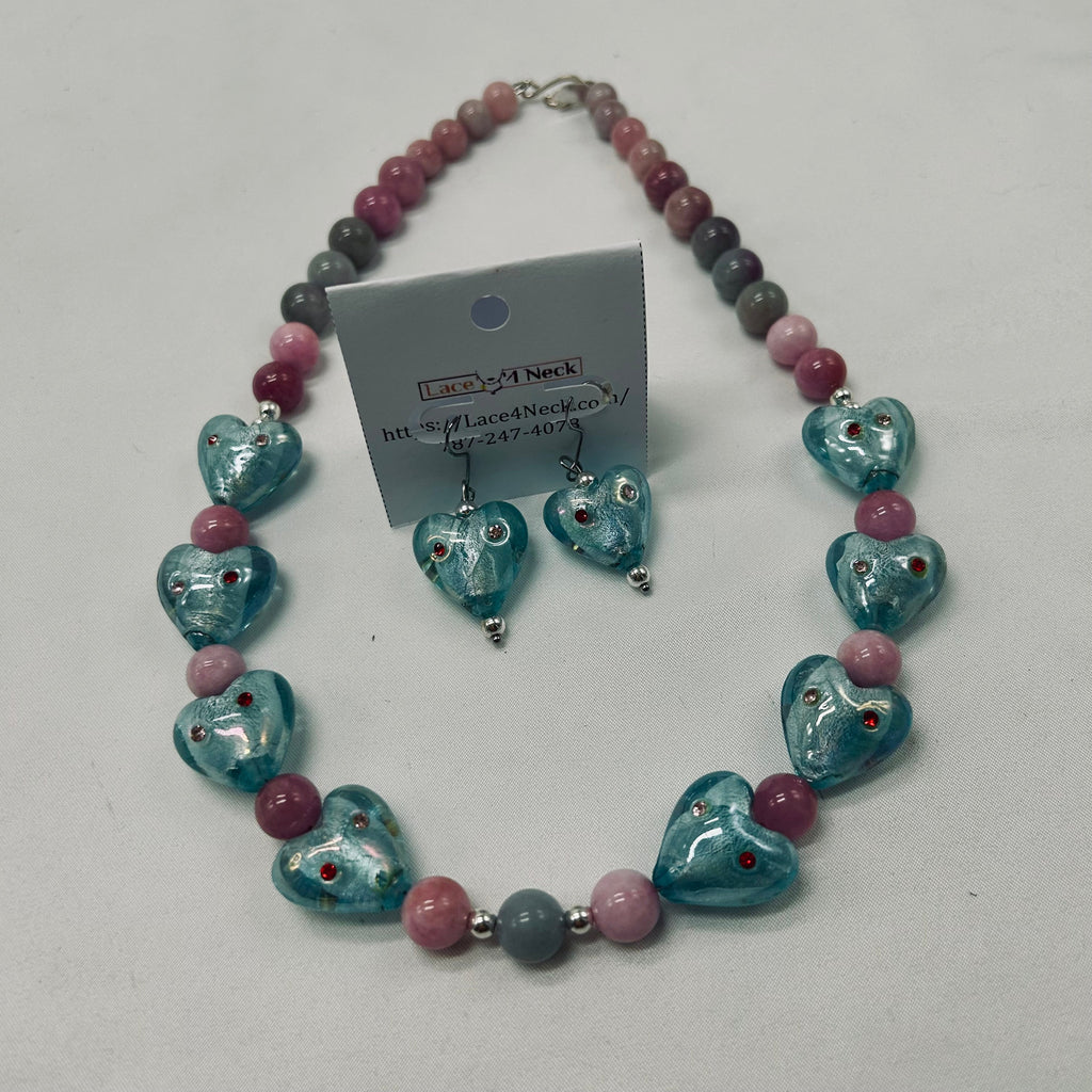 Collar de colores pálidos, con 8 piezas de cristal laminado azul claro [corazones], 31 piezas de piedra Alxa Arcoíris Vibrante [redondas 8mm-10mm] y 6 piezas de hematita plata [redondas 4mm]. Tiene aretes en combinación.