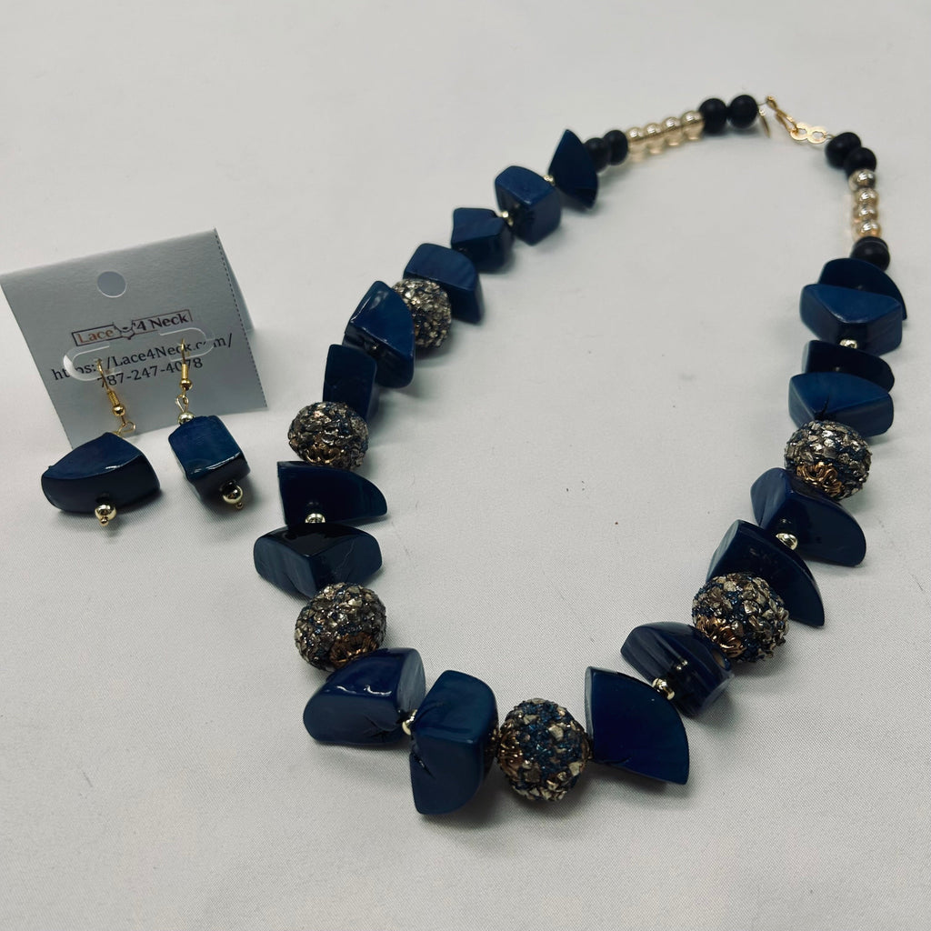 Collar diferente, estilo matiné, con 18 piezas de semilla de tagua azul real [cortes de naranja], 6 piezas de arcilla tibetana azul real brillosas [redondas], 11 piezas de hematita dorada [redondas 5mm] y 8 piezas de cristal crema transparente [redondas 8mm]. Tiene aretes en combinación.