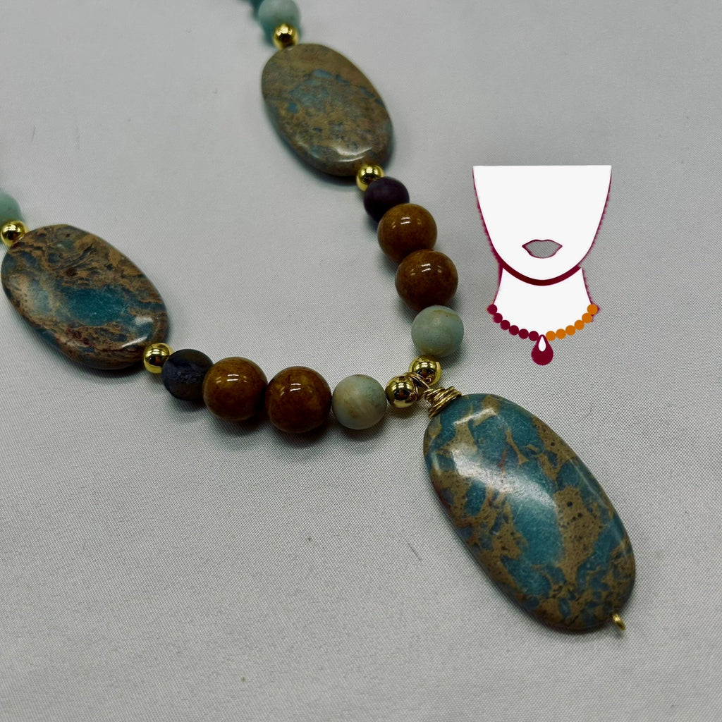 Collar confeccionado con 3 piezas principales de jaspe agua-tierra [óvalos 25x45mm], 24 piezas de amazonita natural [redondas 10mm], 8 piezas de hematita dorada [redondas 6mm] y 8 piezas de fósil crema [redondas 12mm]. Tiene aretes en combinación.