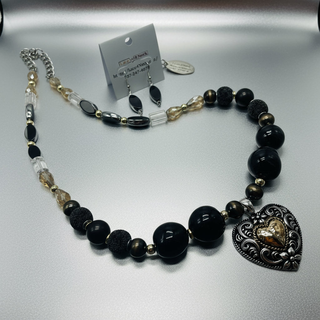 Collar versátil (úsalo corto o largo), confeccionado con variedad de piezas de cristal, cristal de roca-cuarzo transparente, resina de estilo tibetano, acrílico, hematita y colgante de metal dorado-plata, en forma de corazón occidental, unidos por una cadena enchapada en plata. Tiene aretes en combinación.