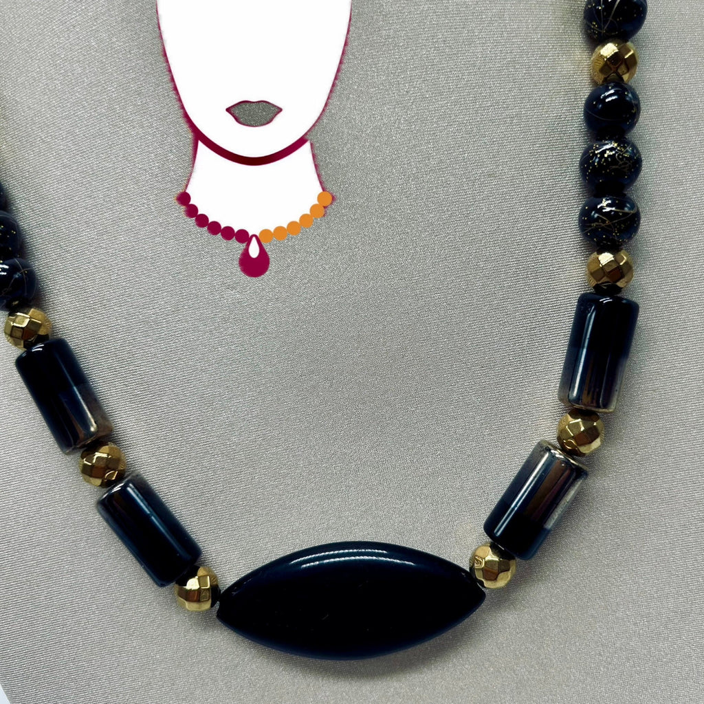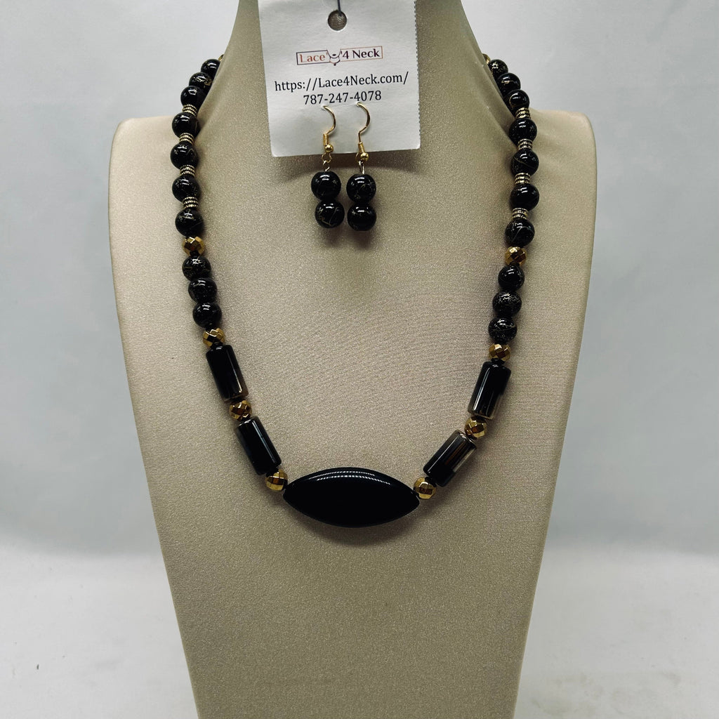 Collar con 20 piezas de cristal negro con destellos dorados [redondas 10mm], 10 piezas de hematita oro, facetadas [redondas 8mm], 4 piezas de cristal dorado/negro [cilindros], 10 piezas de acrílico negro, 8 piezas de estaño dorado [tubos] y una pieza central de porcelana negra [corte marqués]. Tiene aretes colgantes en combinación.