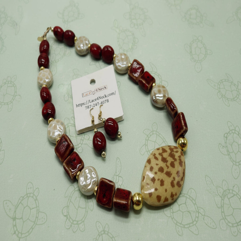 Collar pintoresco, con 16 piezas de cerámica rojas de establo (barn red) o rojo Maroon, hechas a mano [óvalos y cuadrados], 6 piezas de porcelana amarillo claro de vara de oro [redondas planas], 14 piezas de hematita oro [discos y redondas 4mm-10mm] y pieza central de resina-concha tipo caparazón de tortuga. Tiene aretes en combinación.