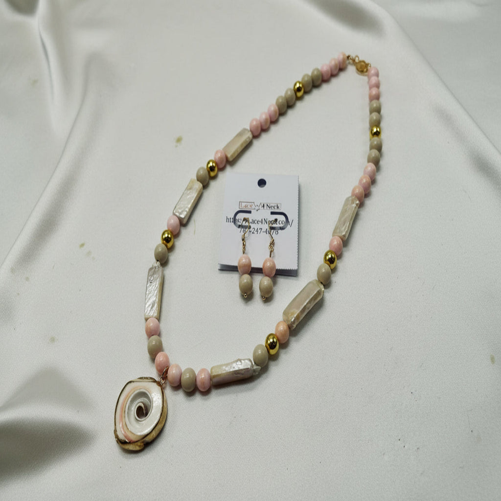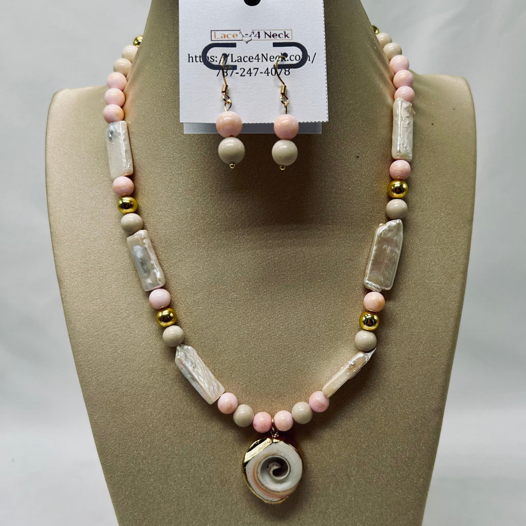 Collar impresionante, con 6 piezas de perlas barrocas Keshi naturales [rectángulos], 14 piezas de fósil hueso [redondas 10mm], 20 piezas de jade rosa claro con destellos dorados [redondas 8mm], 6 piezas de hematita dorada [redondas 8mm] y colgante en metal con corte de caracol. Tiene aretes en combinación.