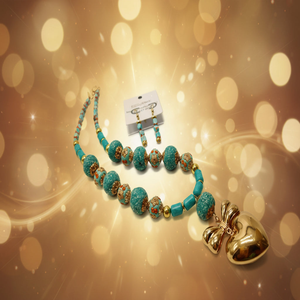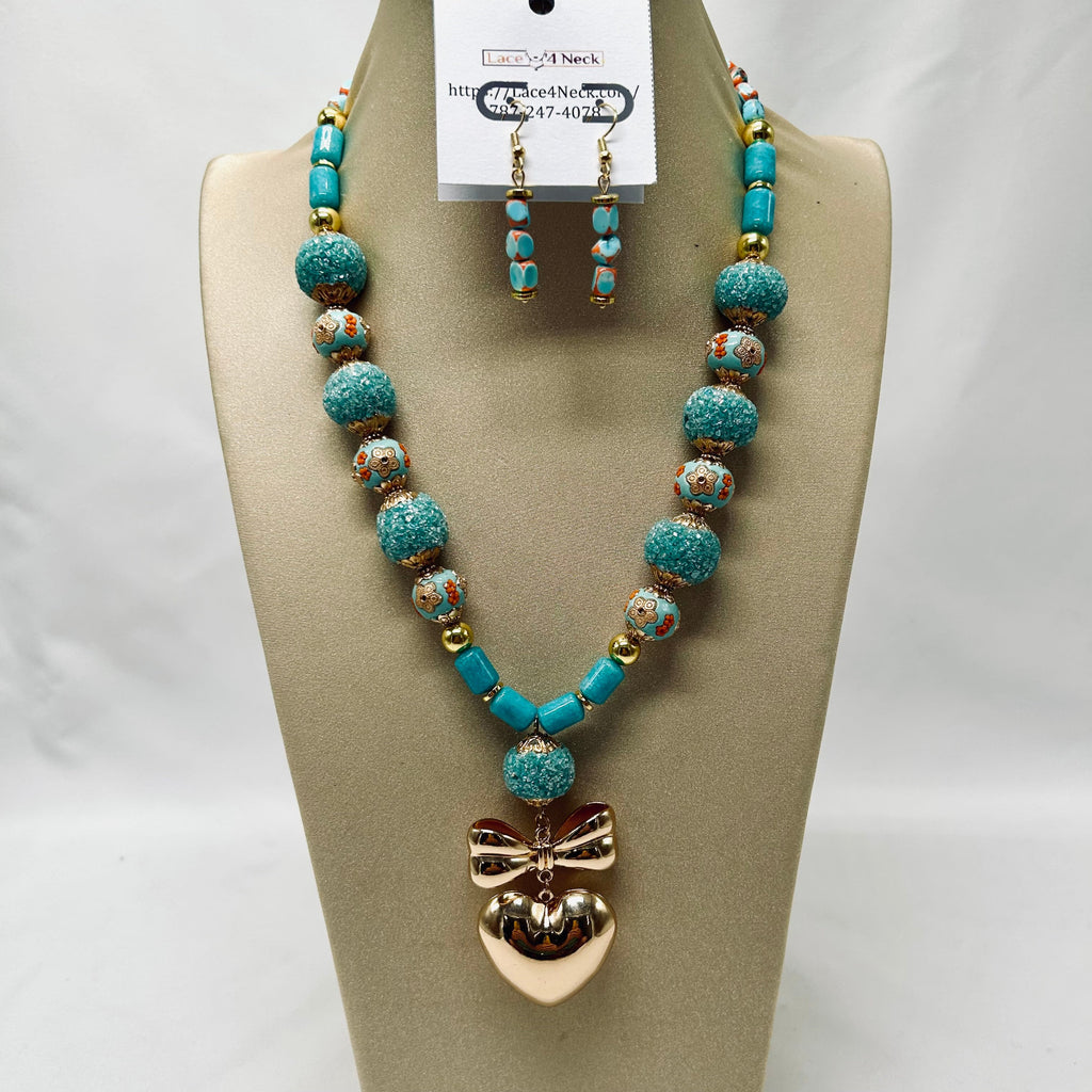 Collar de colores cálidos y suaves, confeccionado con 7 piezas de arcilla escarchada turquesa tibetana [redondas], 6 piezas de resina indonesia turquesa clara, hechas a mano [redondas planas], 20 piezas de jaspe imperial anaranjado natural [cuboides], 8 piezas de jade turquesa [tubos], 10 piezas de hematita oro [discos y redondas 8mm] y colgante de metal en forma de corazón con lazo. Tiene aretes en combinación.