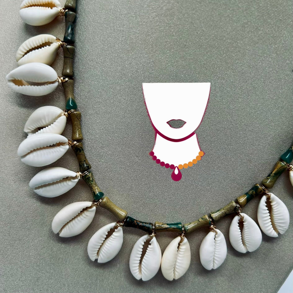 Collar veraniego natural, con 16 piezas principales de caurí oceánico, 21 piezas de verdita [bambú] y 26 piezas de jade africano [redondas 6mm]. Tiene aretes en combinación.