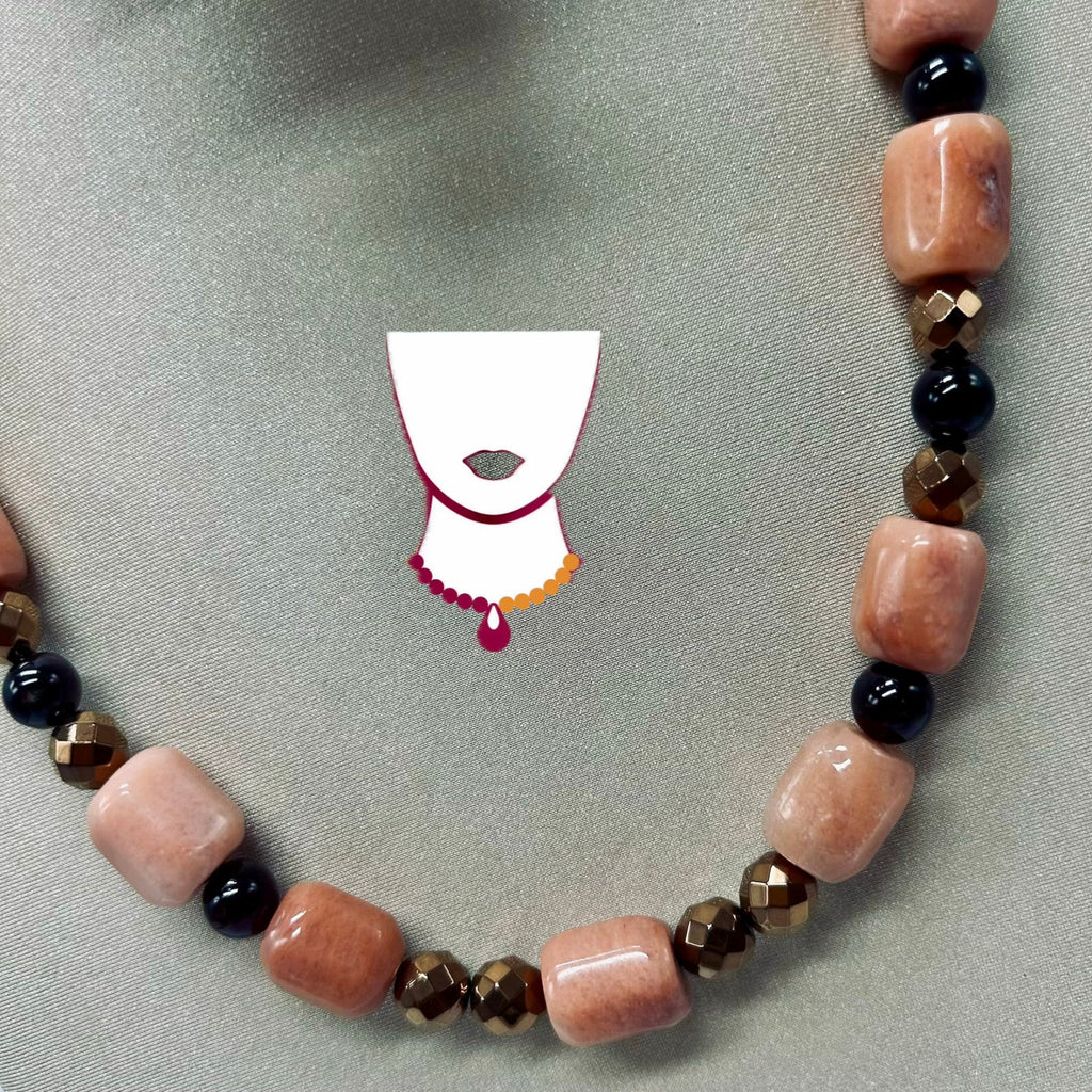 Organizzare significa “orden a tu vida” en italiano, una de las propiedades de la aventurina roja y el granate almandino, la piedra natal de enero. Collar con 17 piezas de aventurina roja [cubos 12mm], 16 piezas de granate rojo [redondas 8mm] y 14 piezas de hematita cobre, facetadas [redondas 8mm]. Tiene aretes en combinación.