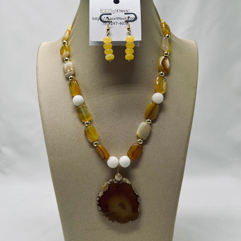 Collar confeccionado con 14 piezas de ágata amarilla [rectángulos], 12 piezas de hematita oro [redondas 6mm], 20 piezas de jade amarillo [ábacos], 4 piezas de porcelana blanca, facetada [redondas 10mm] y colgante de ágata amarilla-verdosa de Brasil. Tiene aretes en combinación.