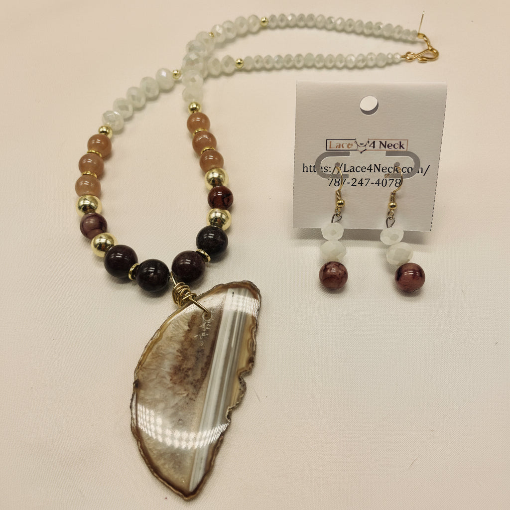 Collar claro, con 4 piezas de jade marmoleado marrón natural [redondas 12mm], 8 piezas de cristal khaki/marrón [redonda 10mm], 50 piezas de acrílico blanco facetado [ábacos de 4 tamaños], 16 piezas de hematita dorada [discos y redondas 4mm-10mm] y colgante de piedra semipreciosa ágata en tonos de blanco/crema (traído de las minas de Colorado, USA). Tiene aretes en combinación.