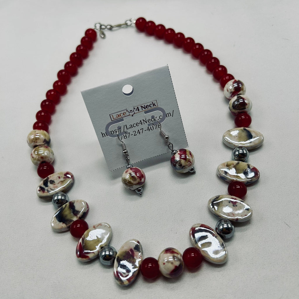 Collar estilo princesa, con 13 piezas protagonistas de porcelana crema-rojo-dorado [óvalos y redondas], 28 piezas de cristal rojo [redondas 10mm] y 4 piezas de hematita plata [redondas 10mm]. Tiene aretes en combinación.