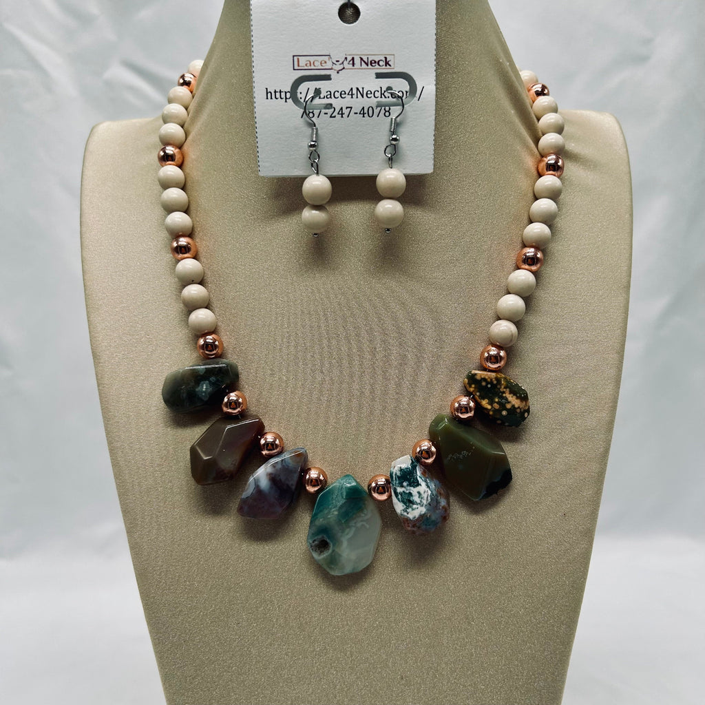 Collar con 7 piezas principales de jaspe oceáno multicolor [multiformes], 16 piezas de hematita oro rosa [redondas 8mm] y 30 piezas de jaspe fósil crema [redondas 8mm]. Tiene aretes en combinación.