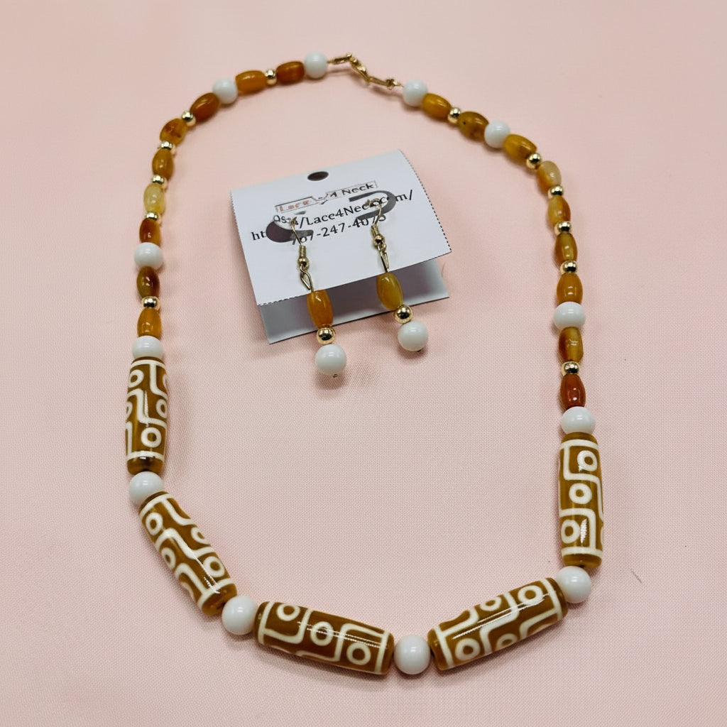 Collar princesa, con 30 piezas de jade amarillo y blanco [óvalo 10mm y redondas 8mm], 12 piezas de hematita dorada [redondas 5mm] y 5 piezas de ágata tibetana, patrón de ojo Dzi, boho antiguo [cilindros]. Tiene aretes en combinación.