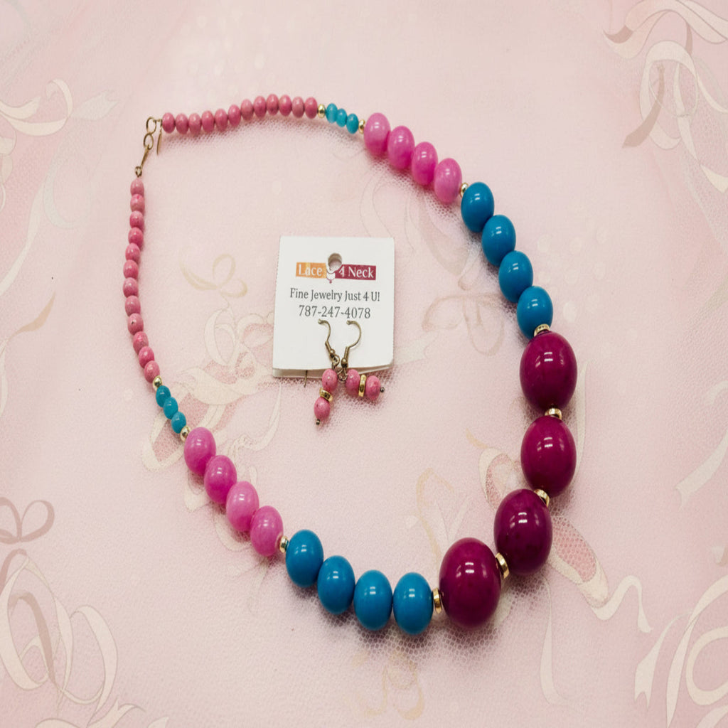 Collar bicolor, con 4 piezas centrales de jade magenta [redondas 20mm], 8 piezas de jade Mashan magenta [redondas 12mm], 8 piezas de jade turquesa [redondas 12mm], 24 piezas de fósil rosa [redondas 6mm], 6 piezas de cuarzo ojo de gato turquesa [redondas 6mm] y 11 piezas de hematita oro [discos y redondas 4mm]. Tiene aretes en combinación.